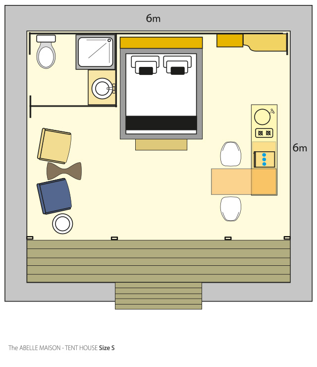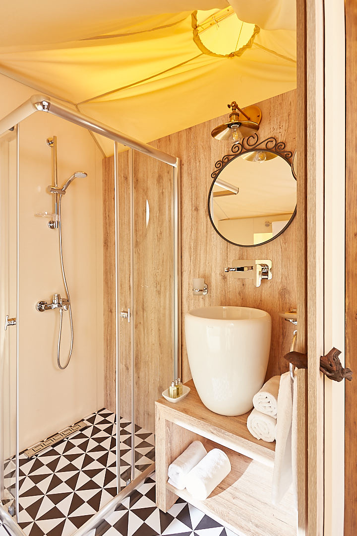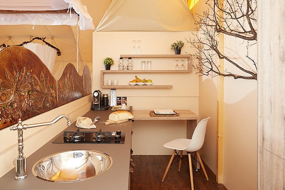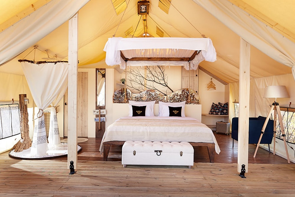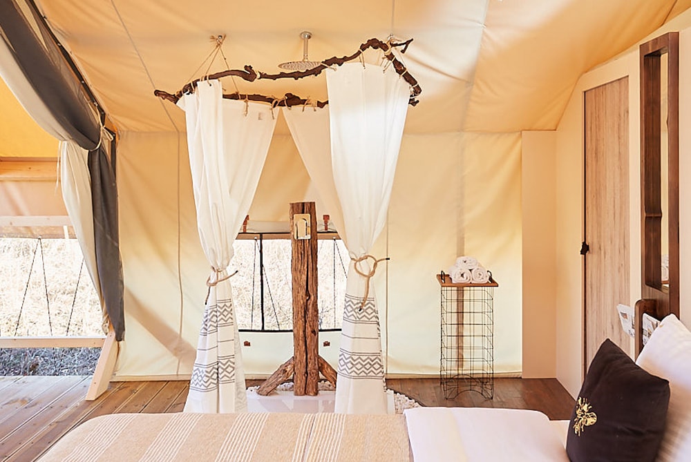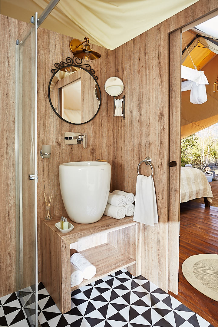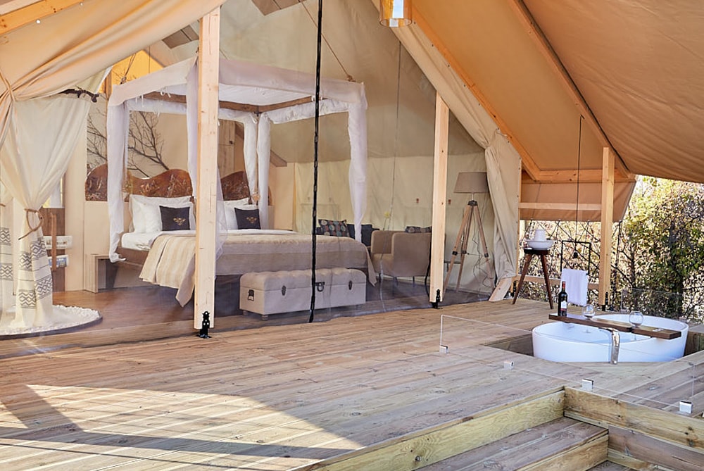 Equipped with stylish furniture, a designer en suite shower, the tent house includes a lavish outdoor bathtub on the deck, constructed with practical finishing materials and a luxurious décor.